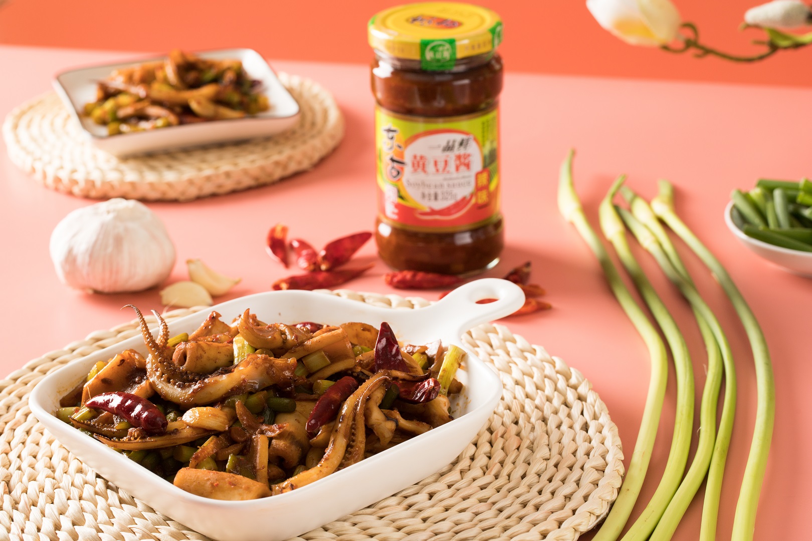 再倒入鱿鱼,,,,,,加入一勺辣椒面、一勺一品鲜酱油、一勺J6国际蚝油、一勺黄豆酱,,,,,,翻炒匀称即可