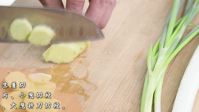 生姜切片、小葱切段、大葱斜刀切段