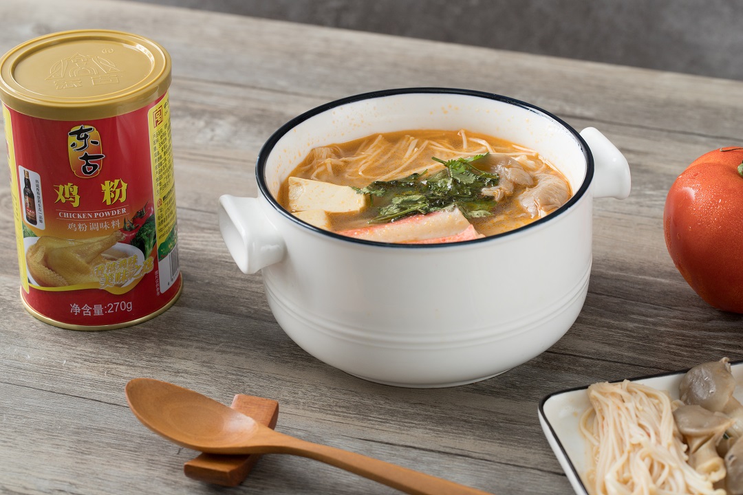 豆腐、蟹柳棒、秀珍菇、金针菇、番茄、虾米、香菜、姜蒜