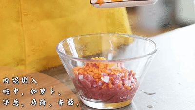 肉泥倒出碗中,,,,,,,加入萝卜、洋葱、马蹄、香菇